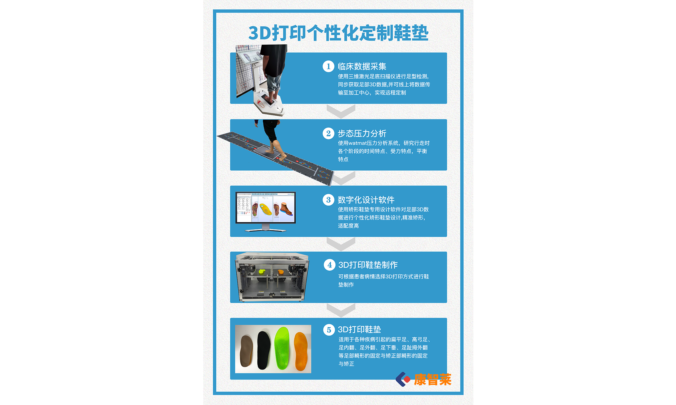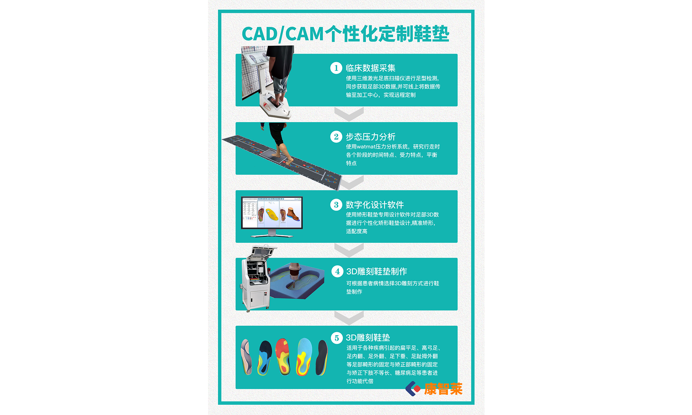 We can provide users with comprehensive solutions for orthopedic insoles, including CAD/CAM systems, 3D sole/foot scanners, gait analysis pressure gauges, CNC machine tools, 3D printers, EVA sheets for insoles, and surface antibacterial materials. With professional technology, years of service experience, and honest business philosophy, we have won the favor of the industry. In 2020, we established Kangzhilai Technology, Focusing on digital foot and spine system solutions: providing equipment such as 3D scanning systems, dynamic pressure systems, CAD intelligent design systems, 3D printing systems, CNC carving systems, etc., as well as system technology and design training