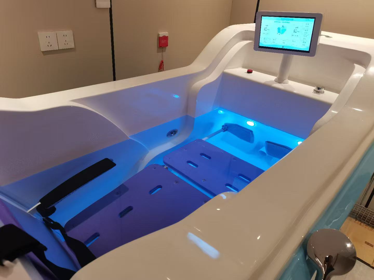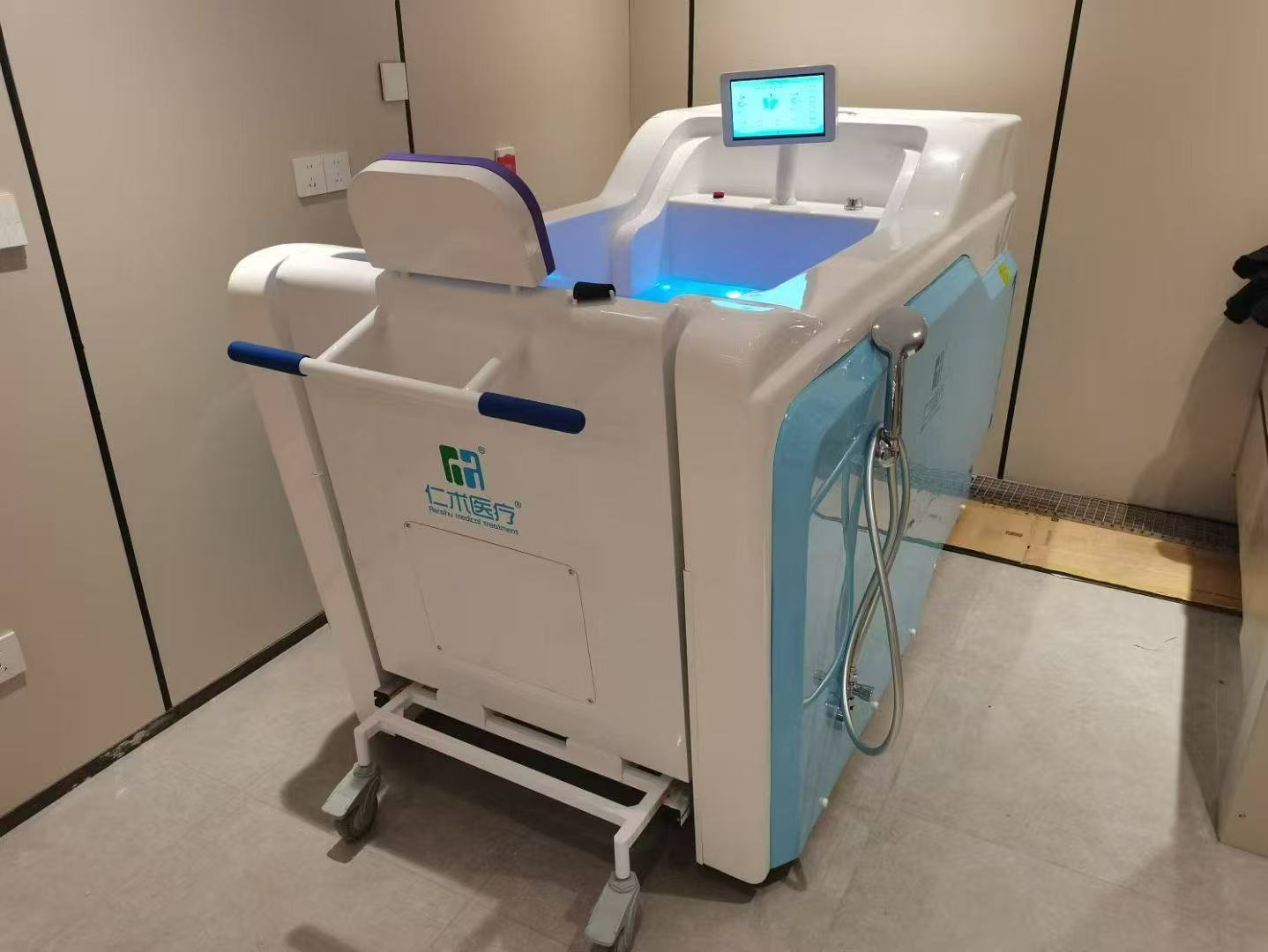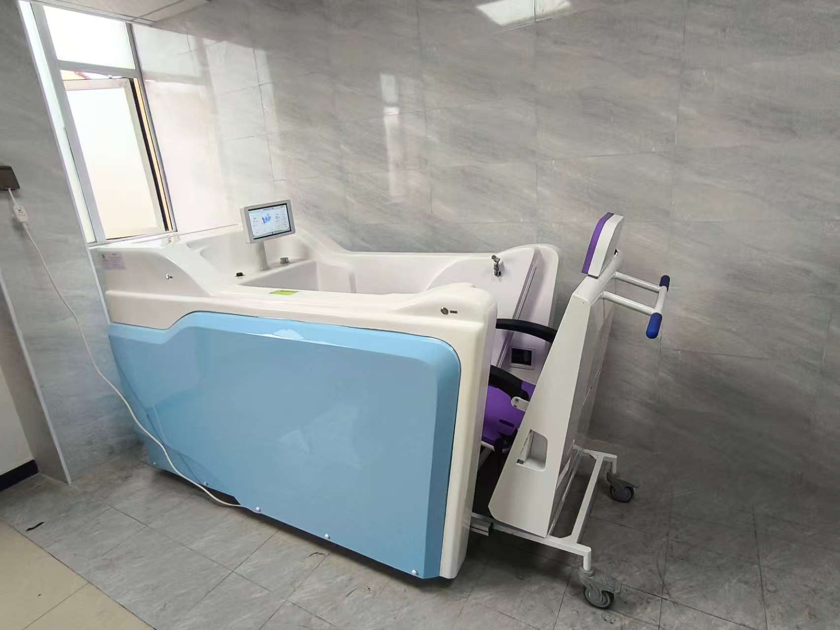 The Accessible wheelchair bath features a 304 stainless steel frame and high-quality fiberglass shell, ensuring material safety and non-irritating properties for mobility-impaired users. Equipped with vortex jets, bubble sprayers, and shoulder-mounted showerheads, it promotes blood circulation and relieves muscle fatigue. Direct wheelchair access reduces caregiving burdens while the automatic water temperature adjustment ensures comfort. The device incorporates dual disinfection systems (ozone and UV) and integrated light therapy with sound therapy to enhance rehabilitation outcomes. Designed with ergonomic principles, the wheelchair guarantees stability and safety. Certified CE, listed in China's National Rehabilitation Assistive Devices Catalog, and compliant with the latest national standards, this product is suitable for hospitals, nursing homes, communities, and households alike.