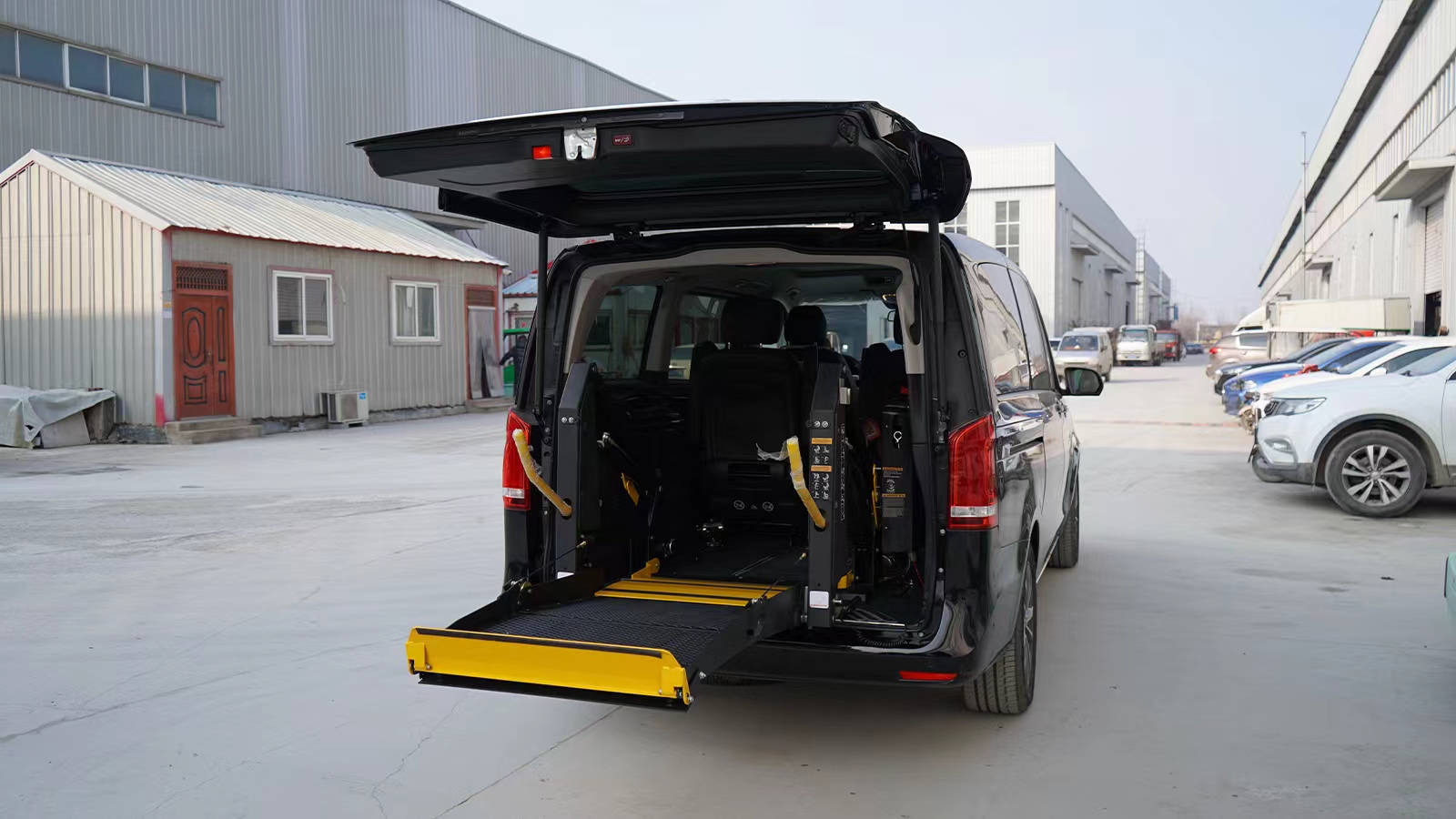 A welfare car designed specifically for special groups using business models as a carrier, equipped with a wheelchair lift that allows people with limited mobility to freely get on and off the vehicle. It is intelligently controlled by a remote control handle, and the lifting process is smooth and noiseless, effectively solving the problem of getting on and off the vehicle for people with disabilities, inconvenience in legs and feet, etc. The wheelchair lift completely solves the problem of getting on and off the vehicle by using methods such as mixing, supporting, holding, and carrying.