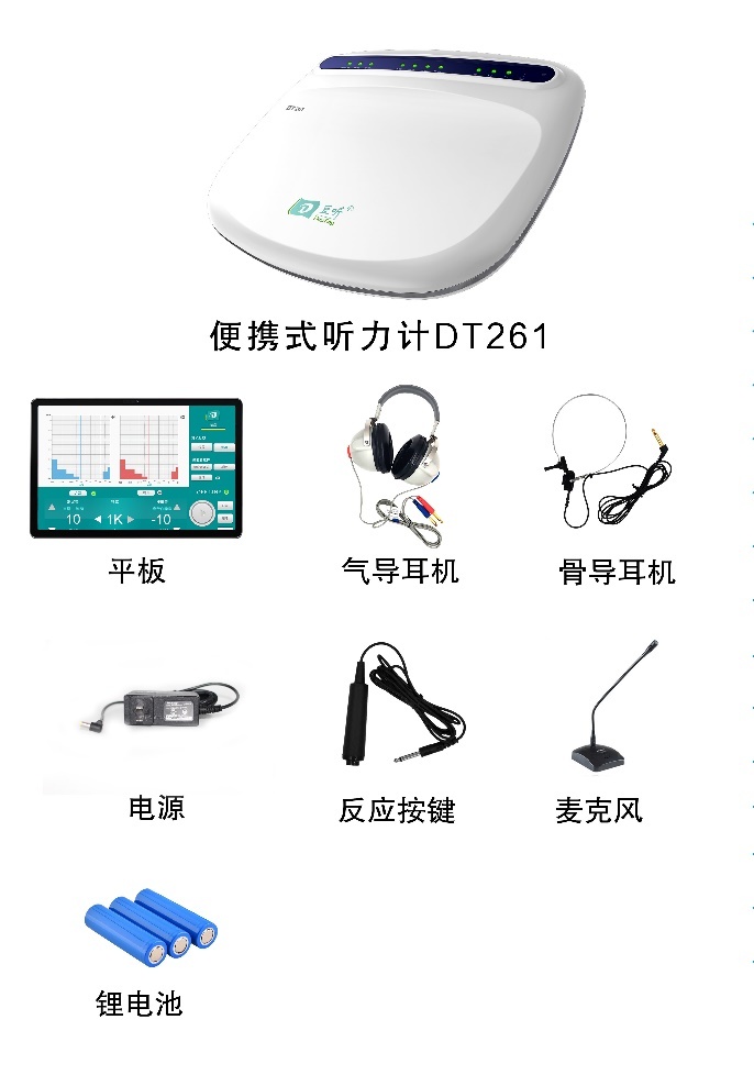 DT261是一款便攜式診斷型聽力計,支持氣導、骨導測試功能。設備采用平板藍牙無線控制,輕便易于攜帶,雙電源超長續(xù)航,熱敏打印便捷,支持數(shù)據(jù)互聯(lián)互通,保障數(shù)據(jù)安全,是移動高端聽力計完美解決方案。方便醫(yī)院接診和醫(yī)生外出義診使用。