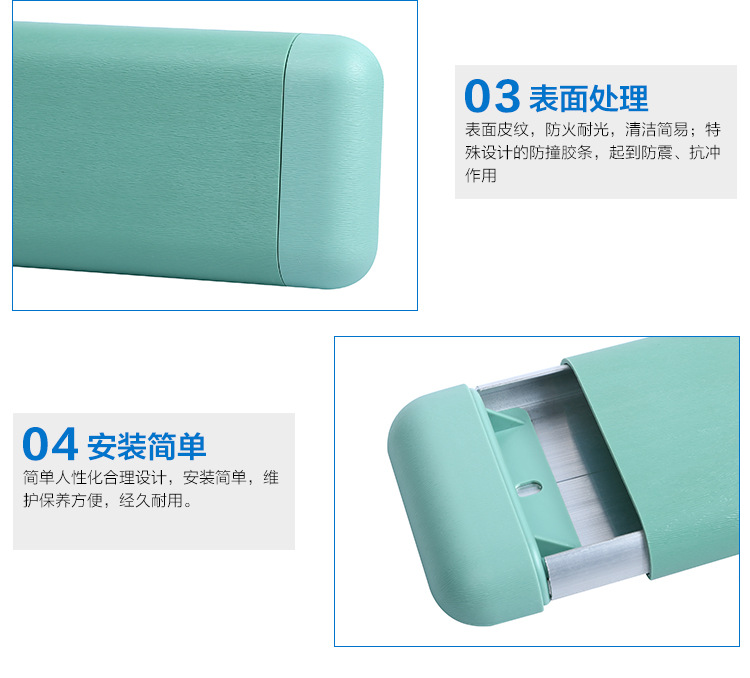 抗菌防撞護(hù)板采用高聚物PVC為外飾物,此PVC有防火、防腐、抗菌、易清潔等效果;安裝簡單,津貼墻面,維護(hù)保養(yǎng)方便,經(jīng)久耐用;3、款式多樣,寬窄均可,色彩豐富;護(hù)板內(nèi)芯為優(yōu)質(zhì)鋁合金專業(yè)設(shè)計(jì),緊固合理;表面批文,防火耐光,清潔簡易;抗菌防撞護(hù)板和抗菌防撞扶手一起使用,整體保護(hù)墻面,防撞、抗擊、抗沖。