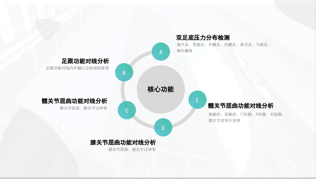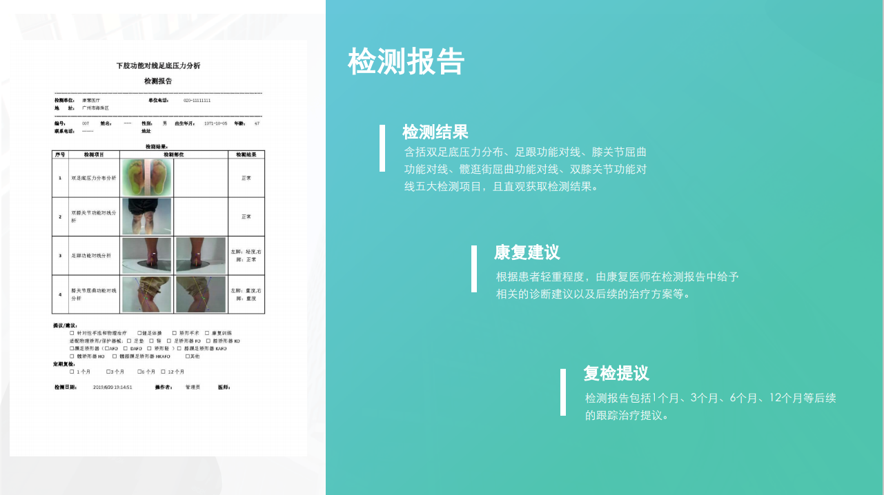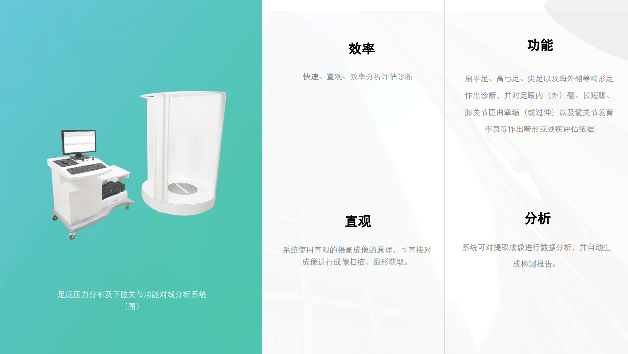 功能:扁平足、高弓足、尖足以及踇外翻等畸形足 作出診斷,并對足跟內(外)翻、長短腳、 膝關節(jié)屈曲攣縮(或過伸)以及髖關節(jié)發(fā)育 不良等作出畸形或殘疾評估依據(jù) 適用單位:康復中心、康復醫(yī)院以 及綜合醫(yī)院設罝的康復 醫(yī)學科 ;假肢、矯形器康復中心;各級康復醫(yī)療機構(三甲康復科)、各級康復訓練機構(康復醫(yī)療康復訓練);各區(qū)設置的康復中心、康復門診、康復療養(yǎng)院、助殘養(yǎng)老機構;兒童特殊學校等