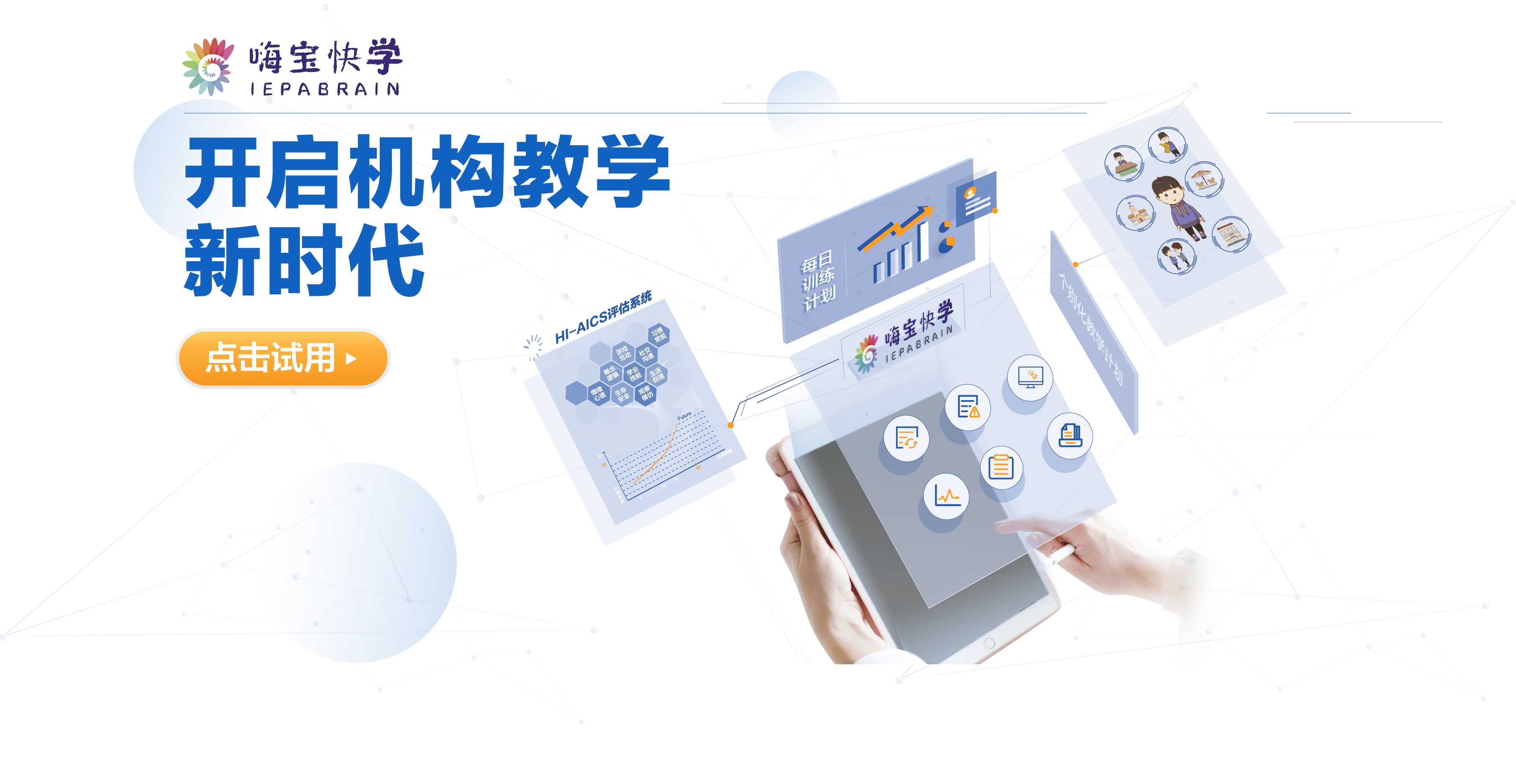 嗨寶快學(xué)作為兒童康復(fù)機(jī)構(gòu)的數(shù)字化教學(xué)系統(tǒng),為康復(fù)機(jī)構(gòu)與老師提供包括兒童能力評估、康復(fù)教學(xué)實(shí)施、教案生成、數(shù)據(jù)記錄、課后作業(yè)管理等服務(wù),提高老師工作效率,協(xié)助機(jī)構(gòu)線下康復(fù)服務(wù)數(shù)字化。