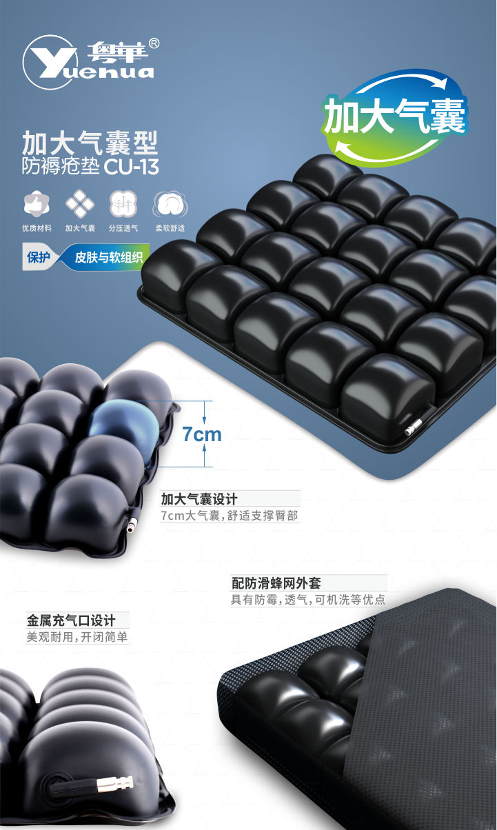 可分散臀部久坐所承受的壓力,促進(jìn)臀部干爽透氣,減輕皮膚和軟組織受到壓迫,預(yù)防和緩解壓瘡。 加大氣囊設(shè)計,坐墊高度7cm,每個氣囊氣流相通,可更好承托臀部。 用于術(shù)后或長期坐臥患者,預(yù)防和緩解壓瘡。