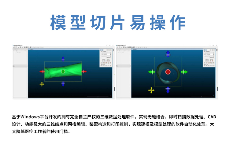 基于Windows平臺(tái)開發(fā)的擁有完全自主產(chǎn)權(quán)的三維數(shù)據(jù)處理軟件,實(shí)現(xiàn)無縫結(jié)合、即時(shí)掃描數(shù)據(jù)處理、CAD設(shè)計(jì)、功能強(qiáng)大的三維結(jié)點(diǎn)和網(wǎng)格編輯、裝配構(gòu)造和打印控制,實(shí)現(xiàn)建模及模型處理的軟件自動(dòng)化處理,大大降低醫(yī)療工作者的使用門檻。