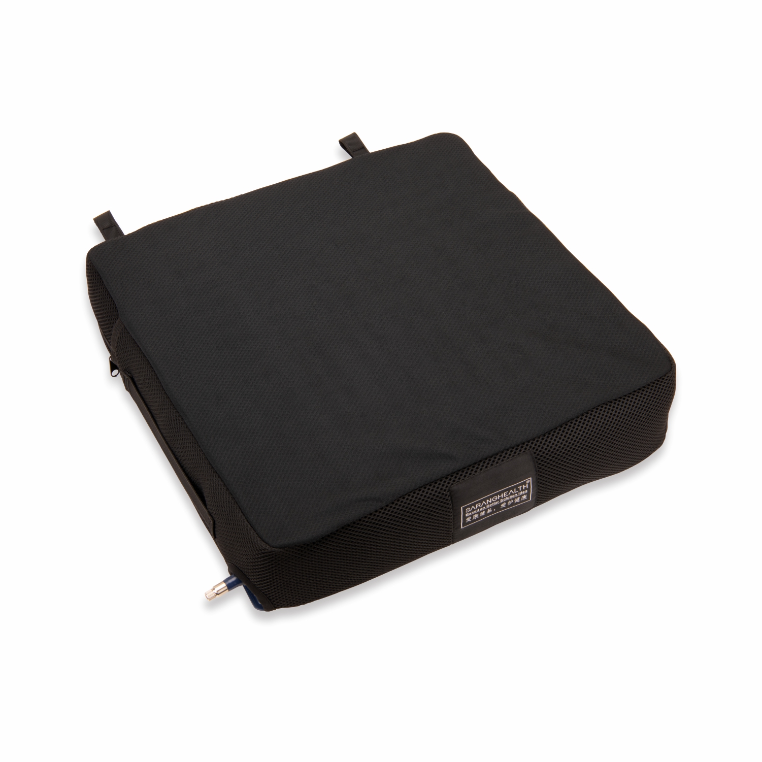 充氣坐墊采用環(huán)保PVC氣囊,內(nèi)置獨立氣囊,氣囊相互連通,易充氣和調(diào)節(jié),依據(jù)空氣流通卸壓原理,能有效預防壓瘡。左、右獨立氣室的雙氣嘴設置,不同的截癱患者左右臀部肌肉收縮程度的高低不同,可通過左、右氣嘴調(diào)節(jié)左、右獨立氣室內(nèi)的空氣量,使截癱患者得到最佳的舒適度及減壓平衡效果。坐墊套面層采用透氣滌綸面料,底部PVC防滑革,拉鏈設置易于清洗。多種尺寸、高度,適合不同輪椅使用者的需求。
