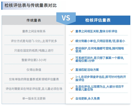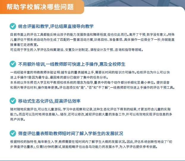 特殊兒童評估干預系統(tǒng)是一套以檢核評估理念為依據(jù)的非標準化評估工具,從特殊兒童能力角度出發(fā),適用于各類特殊兒童,包含感知、認知、運動、社會適應(yīng)、生活自理、社交技巧、語言與溝通七大領(lǐng)域評估,同時系統(tǒng)內(nèi)嵌入的活動方案為新晉特教教師提供了個訓實操參考,是一款簡單實用并兼具專業(yè)性的評估工具。