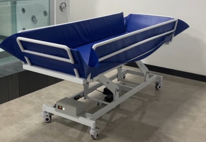 RH-MY-C沐浴床,2000×700×735 mm,304不銹鋼骨架配皮劃艇級(jí)防水海綿墊,可拆洗消毒,無(wú)刺激不過(guò)敏。四邊270 mm護(hù)欄180°旋開(kāi)放,400 mm靜音升降30秒完成,載重150 kg。床體微傾一鍵排水,萬(wàn)向剎輪、防撞條、遙控任意停。內(nèi)置2200 mAh鋰電,日浴10人續(xù)航20天,3 h快充;70 W低噪推桿,水電分離,醫(yī)院、養(yǎng)老院、家庭皆適用。
