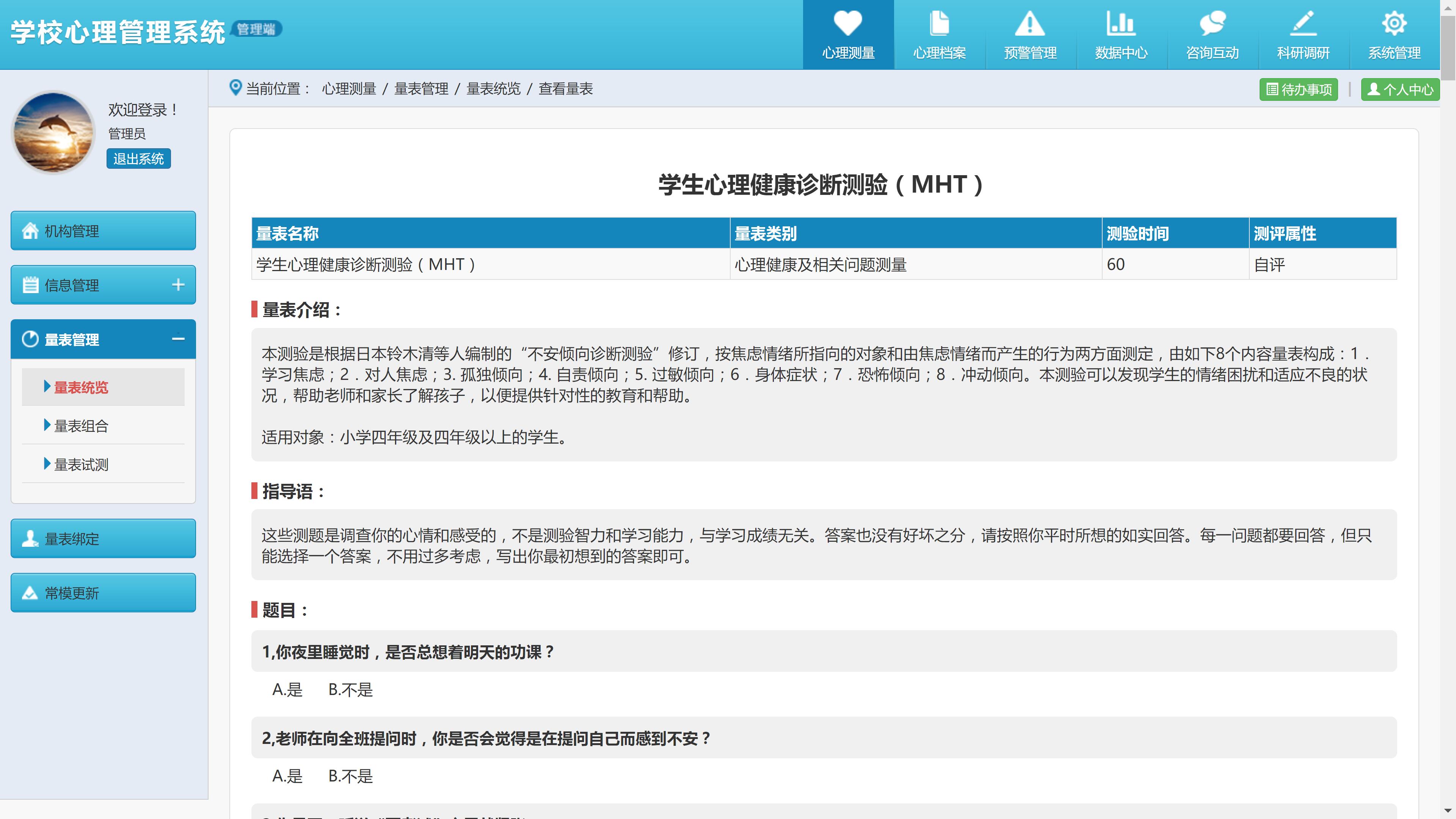 心理健康信息化綜合管理平臺(tái)(心理健康云平臺(tái))是集學(xué)校綜合管理系統(tǒng)、心理咨詢師管理系統(tǒng)、學(xué)生測評(píng)系統(tǒng)、教師測評(píng)系統(tǒng)、家長測評(píng)系統(tǒng)等五大子系統(tǒng)于一體,將校長、心理教師、教師、學(xué)生、家長多角色進(jìn)行分類管理的學(xué)校心理教育工作綜合管理平臺(tái),五大子系統(tǒng)通過綜合的心理健康網(wǎng)站平臺(tái)進(jìn)行集中統(tǒng)合管理。