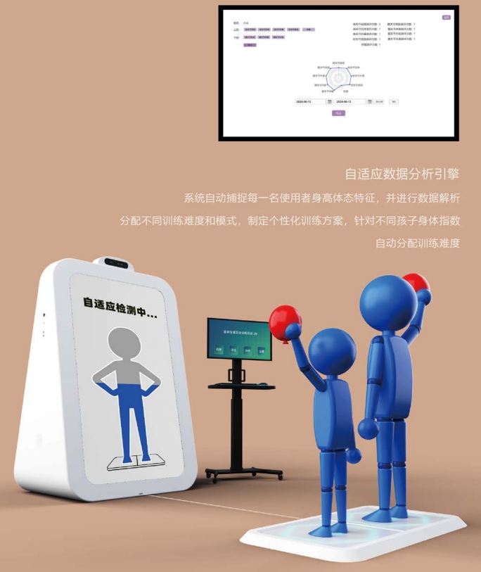 肢體協(xié)調(diào)互動訓練系統(tǒng)采用自適應學習引擎、數(shù)據(jù)分析引擎等核心技術,對兒童的上下肢以及體態(tài)進行全面評估與針對性訓練。 系統(tǒng)內(nèi)置評估功能,康復師可針對每一名兒童進行系統(tǒng)評估,例如:上下肢肌力平衡性、協(xié)調(diào)性等進行科學的評估。大數(shù)據(jù)引擎可對評估結果進行對比與分析,自動生成評估報告,各項功能指標數(shù)據(jù)化、圖形化,一目了然,方便康復師查詢、導出與存檔。