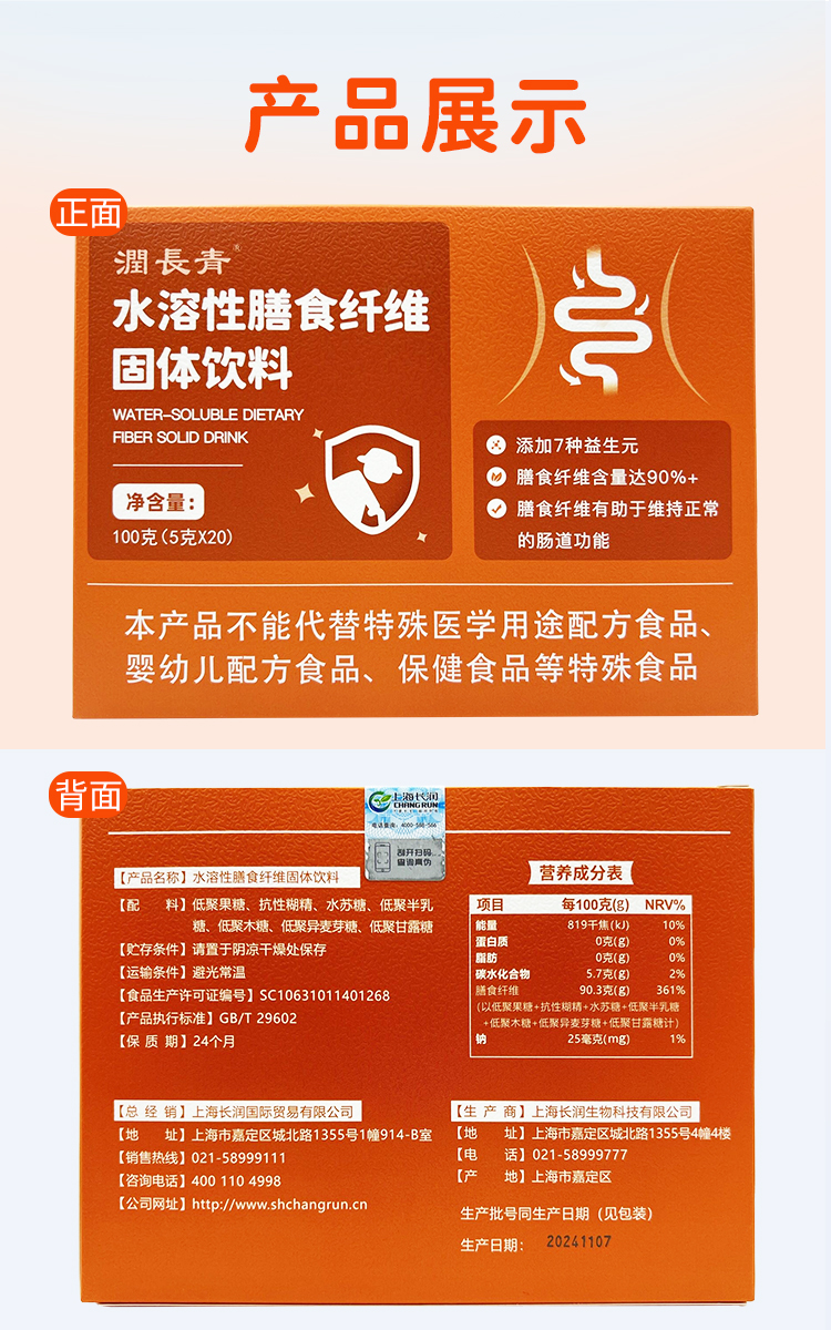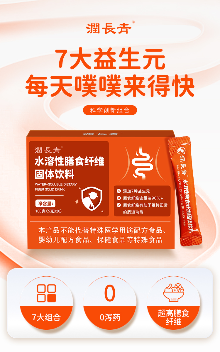 本品富含7種益生元,膳食纖維含量≥90%,膳食纖維有助于維持正常的腸道功能,增加有益菌數(shù)量。本品作為普通食品,不能代替特殊醫(yī)學(xué)用途。