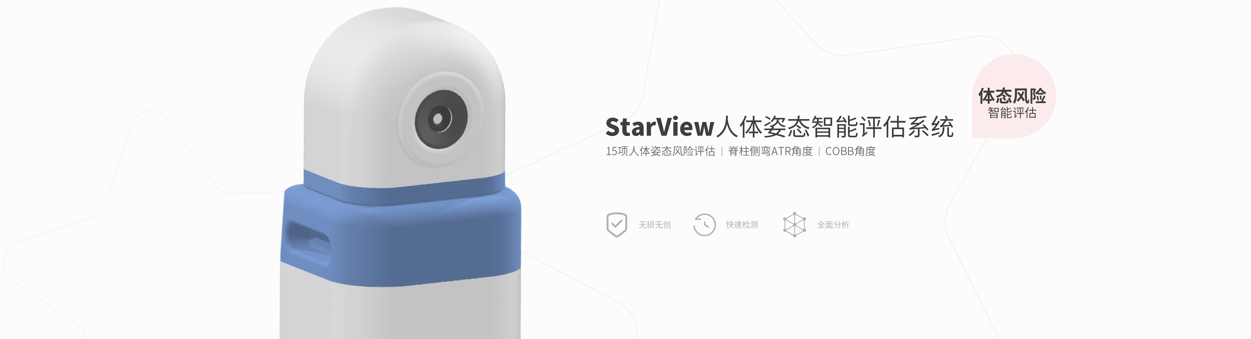 1.StarView人體姿態(tài)智能評估系統(tǒng)提供體態(tài)異常和脊柱側彎篩查專業(yè)檢測評估,無接觸、無輻射、精度高、速度快、操作便捷。 2.運用AI技術精確標記人體關鍵部位,精準檢測數(shù)據(jù),構建體態(tài)模型。 3.1分鐘自動分析10項關鍵風險,脊柱側自動計算ATR角度、COBB角度(C型和S型)。 4.參考國內(nèi)外權威標準,自動生成全體態(tài)評估報告。5.可移動便攜檢測設備,適用于多種場景。