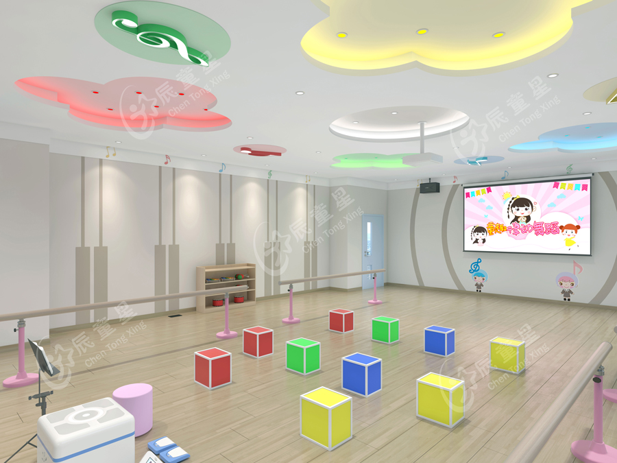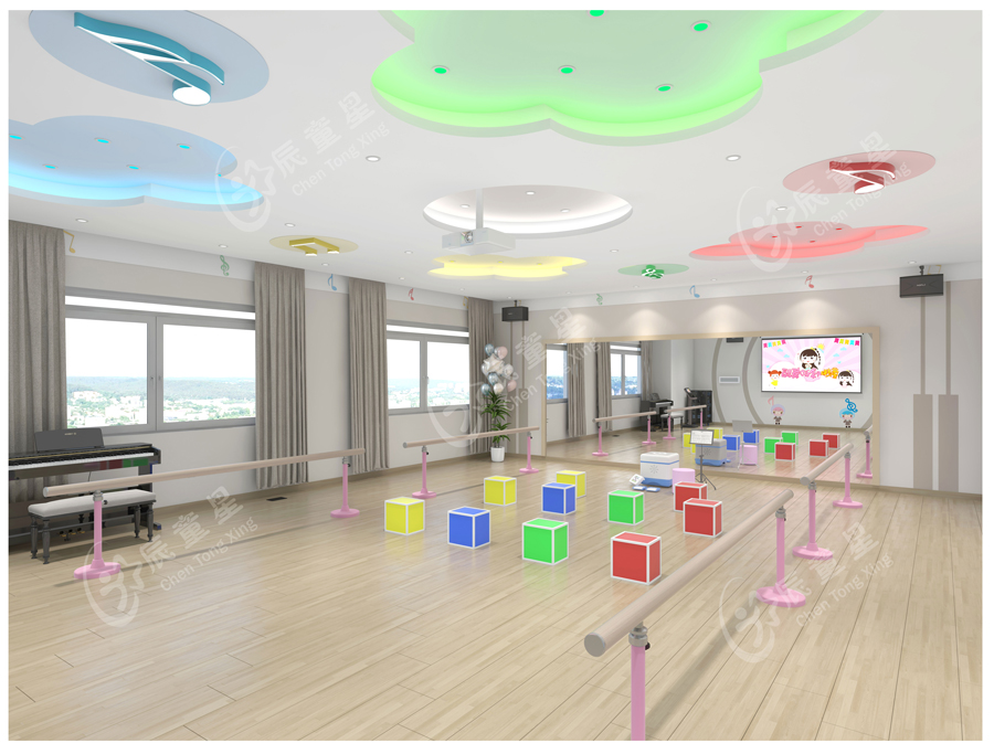 音樂律動室是聽障、盲障、智力障礙學生進行舞蹈、體操、游戲、音樂教學及其它藝術活動的場所,其環(huán)境設計有利于特殊學生通過視覺和殘余聽力模仿動作、感受舞蹈的音樂節(jié)奏。律動教室通過訓練學生的視、聽、觸等綜合能力,使其注意力、記憶力、感知力、結構化能力得到加強。