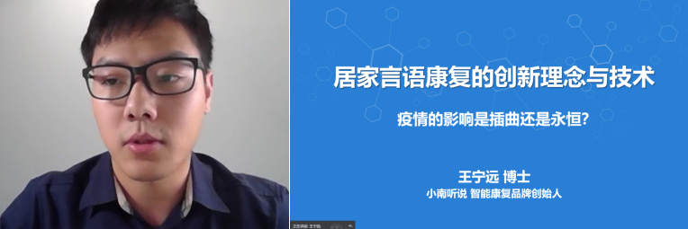 “小南聽說”智能康復品牌創(chuàng)始人、畢業(yè)于美國明尼蘇達大學認知與腦科學專業(yè)的王寧遠博士結合了近年來的技術發(fā)展,與參會人員探討了“創(chuàng)新居家言語康復的理念與技術--疫情的影響是插曲還是永恒?”這樣一個話題。在新技術的加持下,遠程康復與居家康復將會成為傳統(tǒng)線下康復模式的必要補充。
