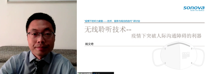中國聾人協(xié)會信息無障礙委員會副主任、索諾瓦(Sonova)聽力全國項目技術經理姚文奇先生為大家分享了“疫情下突破人際溝通障礙的利器——無線聆聽技術”的細節(jié)。