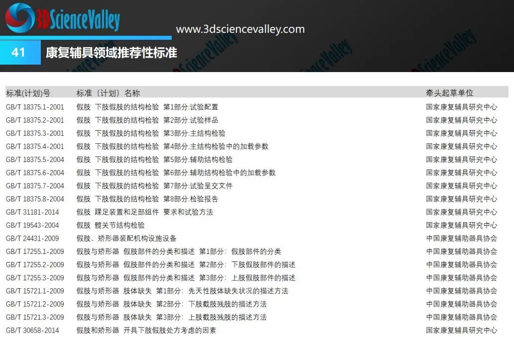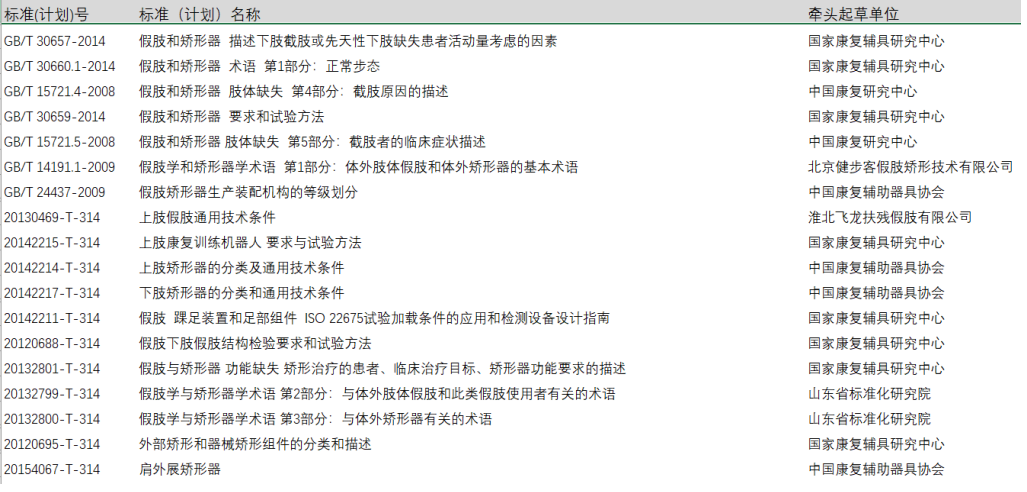 為了規(guī)范康復輔具領域的研發(fā)與應用,國家康復輔具研究中心、中國康復輔助器具協(xié)會等單位牽頭起草了一系列假肢、矯形器、康復機器人等產(chǎn)品的推薦性標準,以下標準清單可供參考: