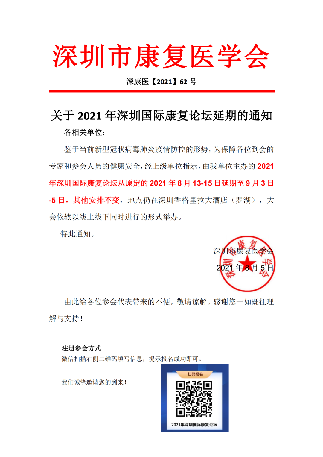 鑒于當(dāng)前新型冠狀病毒肺炎疫情防控的形勢(shì),為保障各位到會(huì)的專家和參會(huì)人員的健康安全,經(jīng)上級(jí)單位指示,2021年深圳國(guó)際康復(fù)論壇從原定的2021年8月13-15日延期至9月3日-5日,其他安排不變,地點(diǎn)仍在深圳香格里拉大酒店(羅湖),大會(huì)依然以線上線下同時(shí)進(jìn)行的形式舉辦。由此給各位參會(huì)代表帶來(lái)的不便,敬請(qǐng)諒解。