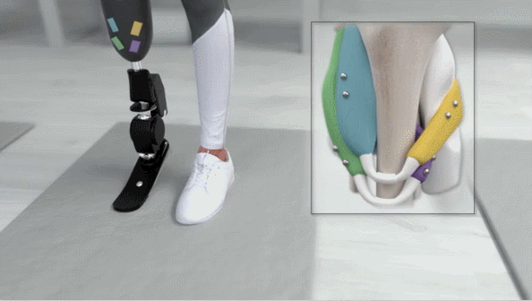為了讓截肢者控制假肢,這些測量結(jié)果會被輸入到計算機模型中。該模型根據(jù)截肢者剩余肌肉的收縮情況來預測其希望進行的動作。這種策略引導假肢按照截肢者希望的方式來移動,與他們想象中的肢體位置相匹配。