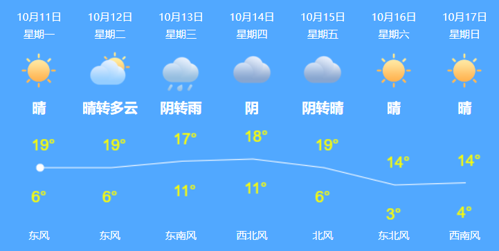 未來一周,北京天氣多變,10月13日有雨,15-17日轉(zhuǎn)晴。氣溫4~19℃,早晚溫差較大,建議備好防寒衣物。
