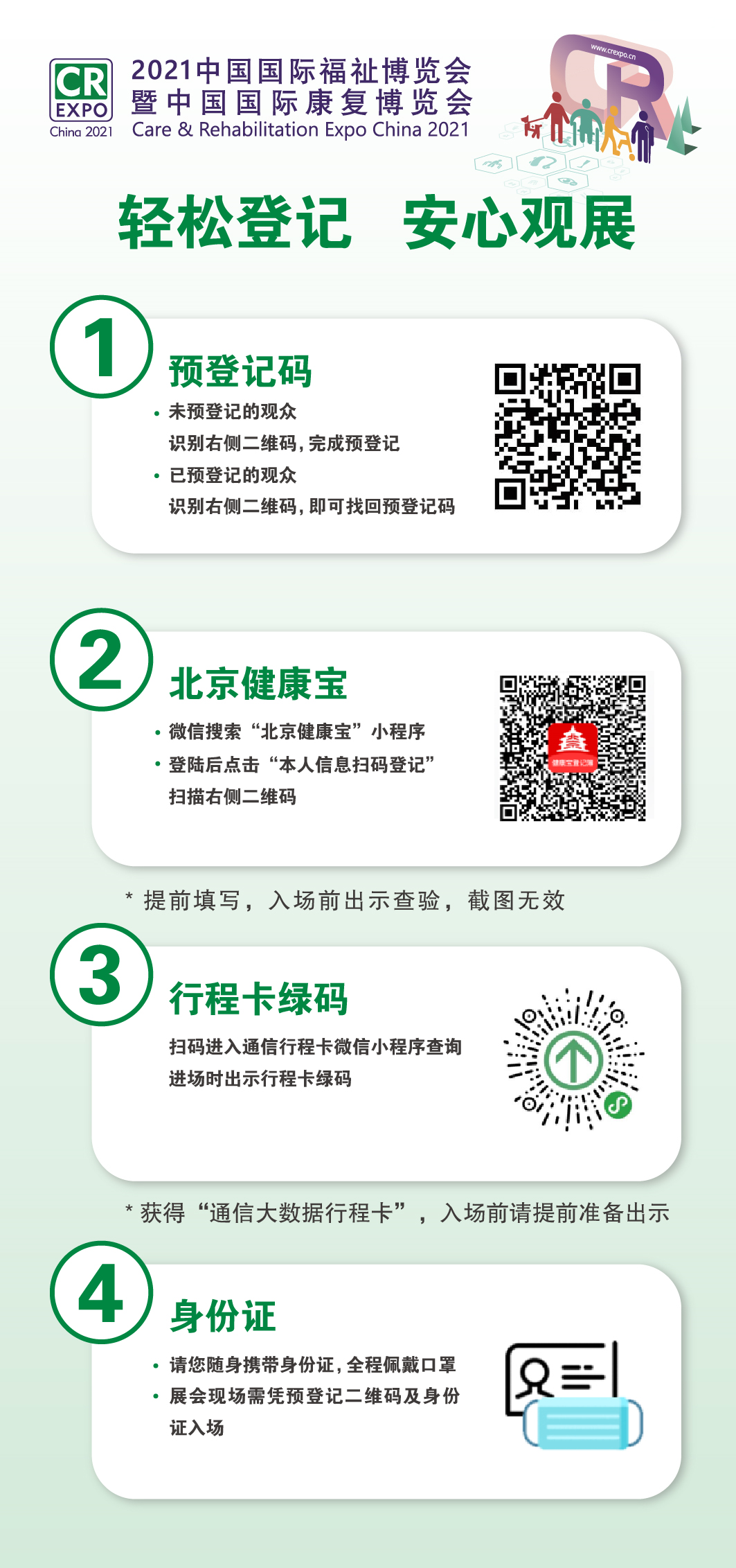 (3)所有進(jìn)場人員均須實(shí)名制登記,出示“北京健康寶+行程碼綠碼“方可進(jìn)入展館,出示“預(yù)登記成功二維碼+身份證” 換取胸卡,方可進(jìn)入展廳參觀。
