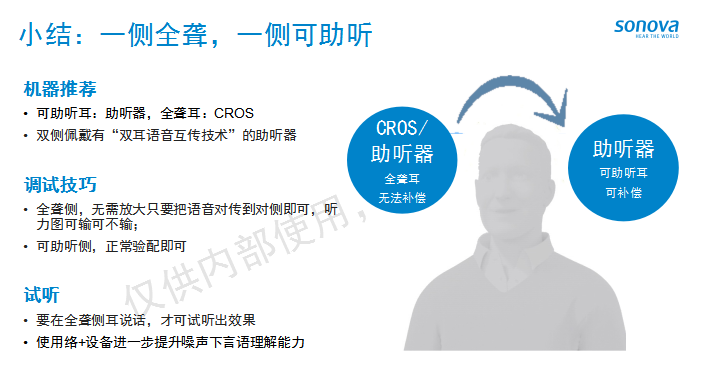 非對稱性聽力損失主要有兩種類型,一種為一側(cè)全聾,一側(cè)可助聽;另一種為雙側(cè)都可助聽但有較好耳。分享會(huì)上,孫靜分別為我們介紹了兩種類型的主要解決方案,并提出面對非對稱性聽力損失,不應(yīng)放棄雙耳驗(yàn)配,要積極發(fā)揮雙耳語音互傳技術(shù)實(shí)現(xiàn)“BICROS”功能。