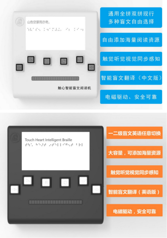 觸心智能盲文閱讀機(jī)有助于解決目前漢語盲文資源嚴(yán)重不足的難題。用戶可以閱讀海量漢語文檔,通用、全拼、現(xiàn)行、雙拼等盲文類型可以自由選擇;觸心智能盲文英語機(jī)有助于解決目前英語盲文資源嚴(yán)重不足的難題。用戶可以閱讀海量英語文檔,一級英語盲文、二級英語盲文可以自由選擇。