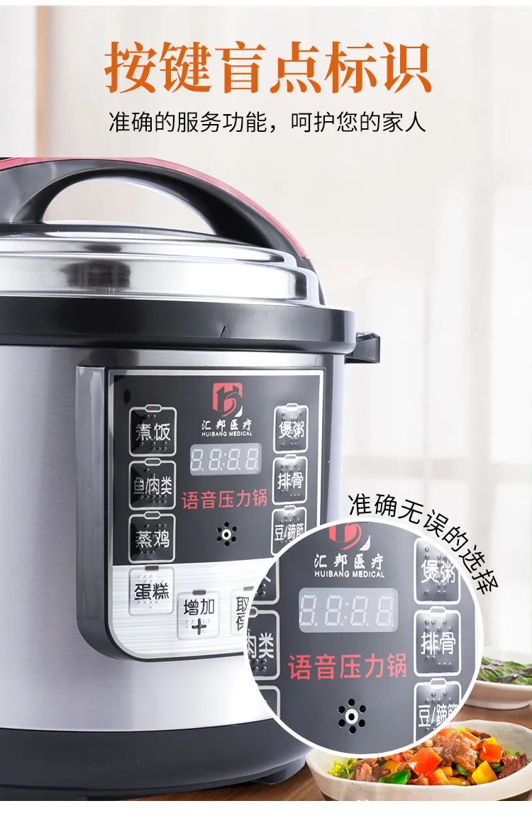 每一個操作按鍵都具有語音報讀功能,以及盲文點標(biāo)識和LED指示燈;具有LED四位數(shù)碼顯示屏,可顯示時間信息;材質(zhì):不銹鋼外殼,不銹鋼蓋子,食品級塑料蓋子防護,鋁合金內(nèi)膽;具有一鍵式功能選擇鍵:具有煮飯、煲粥、魚/內(nèi)類、排骨、蒸雞、豆/蹄筋、蛋糕、收汁入味八種功能可選擇。