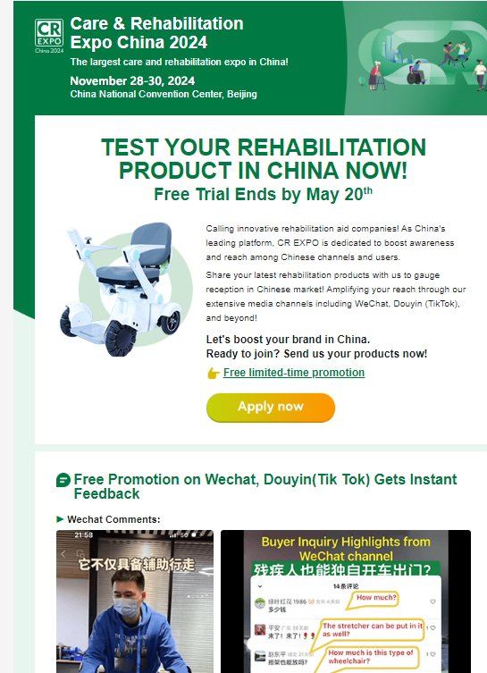 目前CR福祉博覽會(huì)在海外推廣上全力出擊,通過(guò)海外社媒、線上精準(zhǔn)營(yíng)銷(xiāo)、EDM營(yíng)銷(xiāo)、海外展會(huì)等多渠道推廣,將更多國(guó)際買(mǎi)家“引進(jìn)來(lái)”,推動(dòng)更多展商“走出去”!