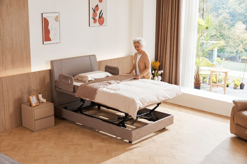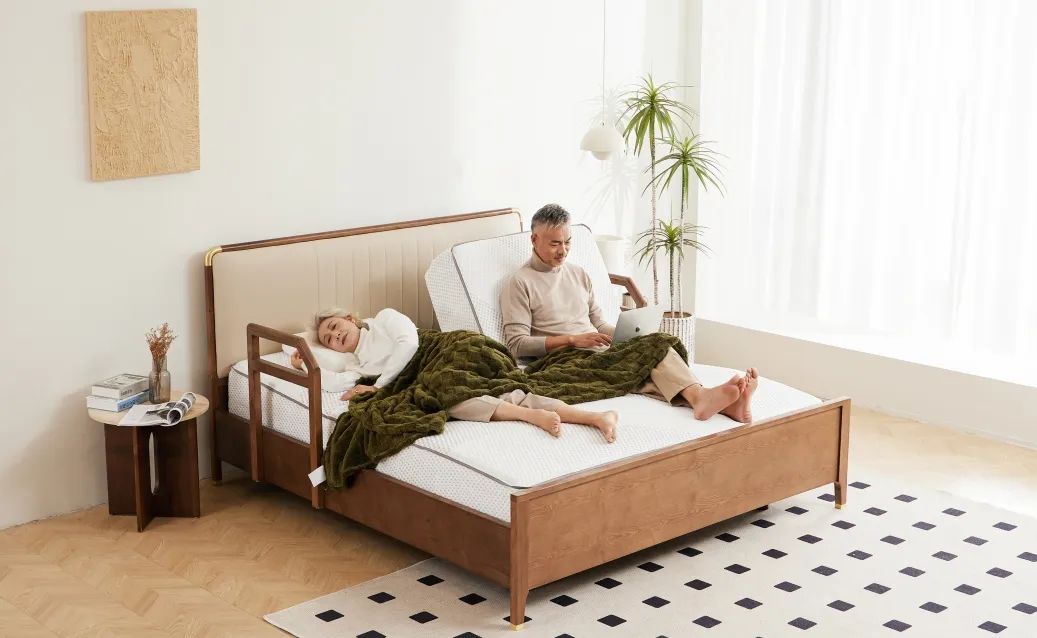 世道為老年提供不同任命周期的提升睡眠品質(zhì)的智能電動床,包括給活力老人 lifestyle base, 輕介護階段的居家養(yǎng)老床,還有重度照護的養(yǎng)老床,以及年輕人的居家電動床。