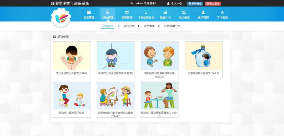 系統(tǒng)內(nèi)置了如:TTAP、C-PEP-3等國(guó)內(nèi)外權(quán)威的評(píng)估工具,涵蓋了從幼兒到成人的不同年齡階段的自閉癥人群的評(píng)估需求。并根據(jù)自閉癥人群的信息加工特點(diǎn)研發(fā)了感知覺(jué)、社會(huì)交往、語(yǔ)言溝通等八大維度的訓(xùn)練內(nèi)容,教師可以根據(jù)學(xué)生情況設(shè)置有針對(duì)性的課程,制定個(gè)別教育計(jì)劃,提高了教師的工作效率與工作質(zhì)量,搭建起家校溝通的橋梁。