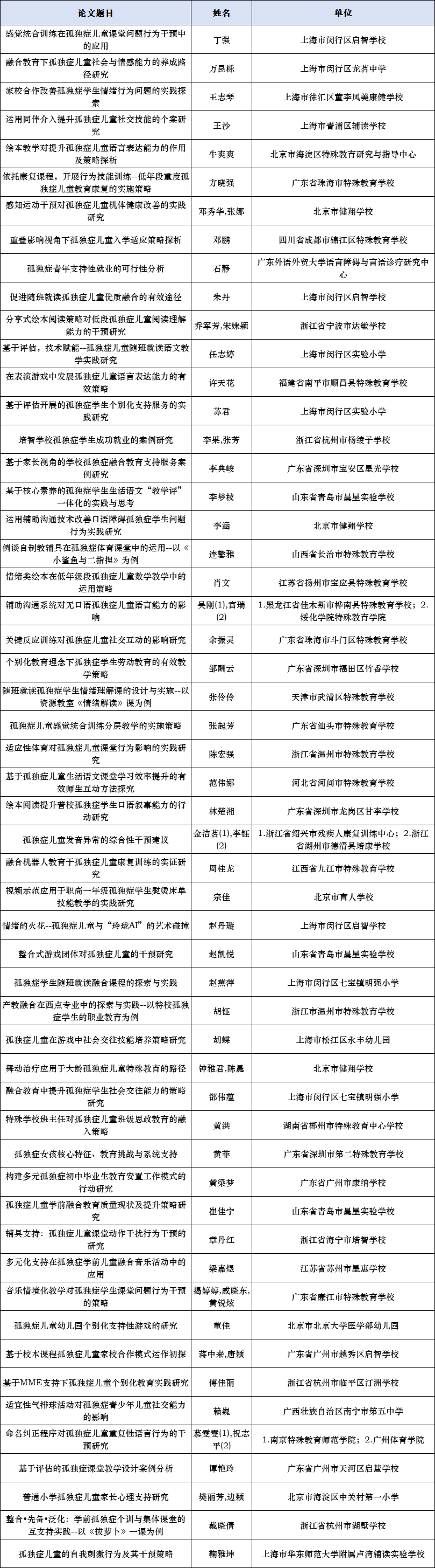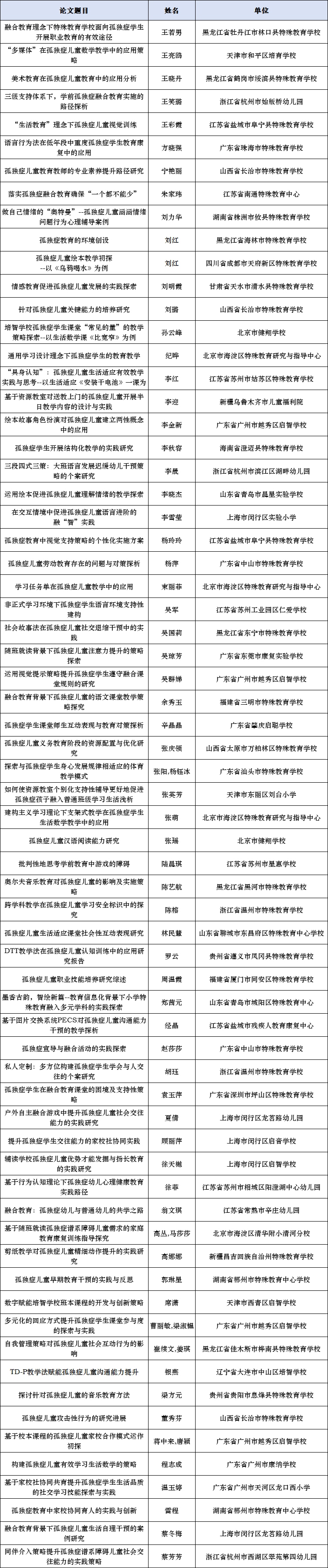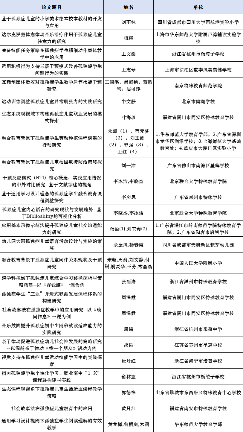 公布第一屆孤獨(dú)癥教育教學(xué)征集優(yōu)秀組織單位,優(yōu)秀、創(chuàng)新和鼓勵(lì)論文名單;公布第一屆孤獨(dú)癥教學(xué)案例優(yōu)秀組織單位,優(yōu)秀、創(chuàng)新和鼓勵(lì)課例名單
