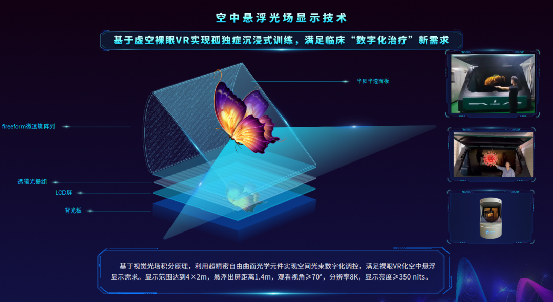 基于視覺光場積分原理,利用超精密自由曲面光學(xué)元件實(shí)現(xiàn)空間光束數(shù)字化調(diào)控,滿足裸眼VR化空中懸浮顯示需求。最大顯示范圍達(dá)到4×2m,最大懸浮出屏距離1.4m,觀看視角≥70°,顯示亮度≥350 nits。系統(tǒng)可通過采集用戶語音、姿態(tài)、手勢、眼神、面部表情等多模態(tài)行為學(xué)特征實(shí)現(xiàn)沉浸式、非接觸的隔空人機(jī)交互訓(xùn)練,滿足臨床“數(shù)字化治療”新需求。為當(dāng)前國內(nèi)最大顯示范圍、出屏距離裸眼VR系統(tǒng)。
