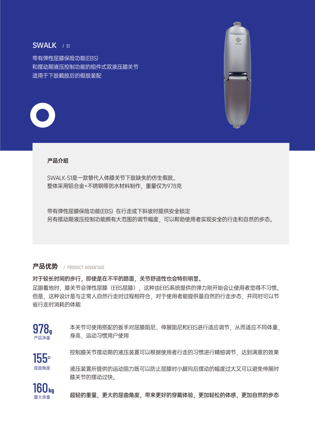 SWALK-S1是一款替代人體膝關(guān)節(jié)下肢缺失的仿生假肢。整體采用鋁合金+不銹鋼等防水材料制作,重量僅為978克。