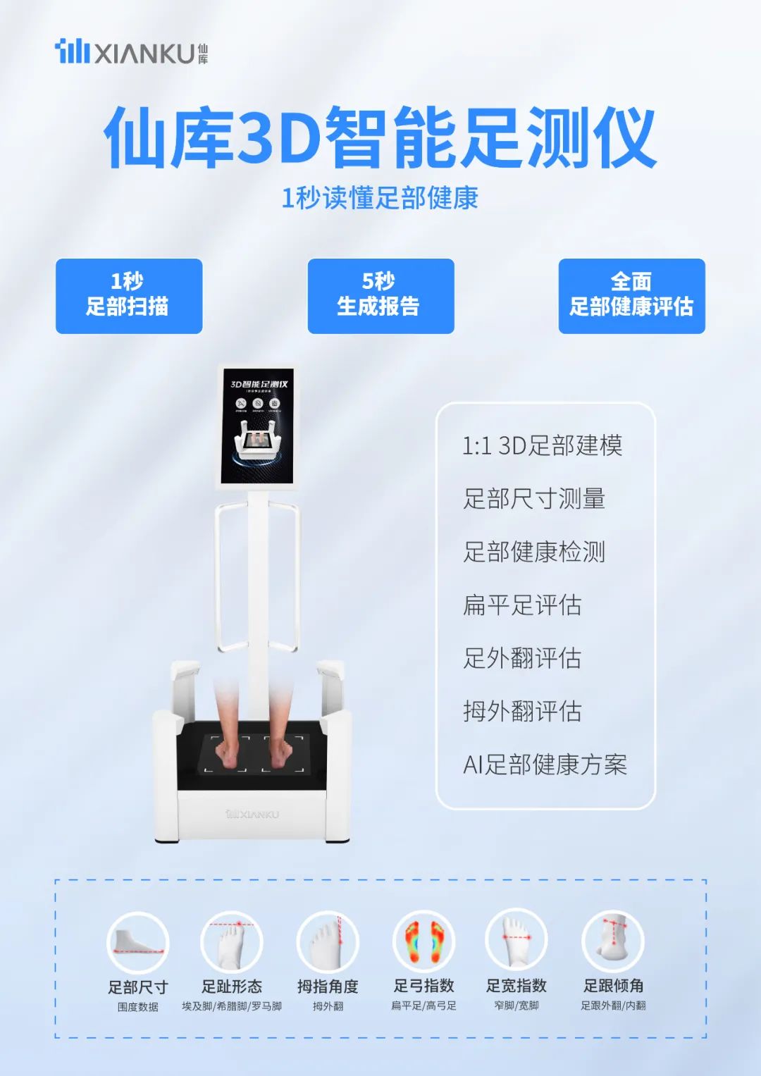 仙庫3D智能足測儀B002通過3D結(jié)構(gòu)光掃描技術(shù),只需要1秒鐘,即可完成足部3D建模測量及腳型分析,評估扁平足、高足弓、足跟側(cè)翻、拇外翻等足部健康風(fēng)險,輸出包含足部尺寸、足類型、足趾形態(tài)、足底分析、足跟傾角等多項專業(yè)數(shù)據(jù)的3D足部健康報告,可實現(xiàn)智能推薦鞋碼款式、定制健康足弓鞋墊、足部健康方案制定等足部健康應(yīng)用??蓮V泛適用于醫(yī)療康復(fù)、運動健身、鞋業(yè)門店等場景。