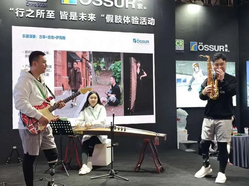 11月28日,2024中國國際福祉博覽會暨中國國際康復(fù)博覽會,三名佩戴假肢的表演者上演合奏節(jié)目。劉胤衡/攝