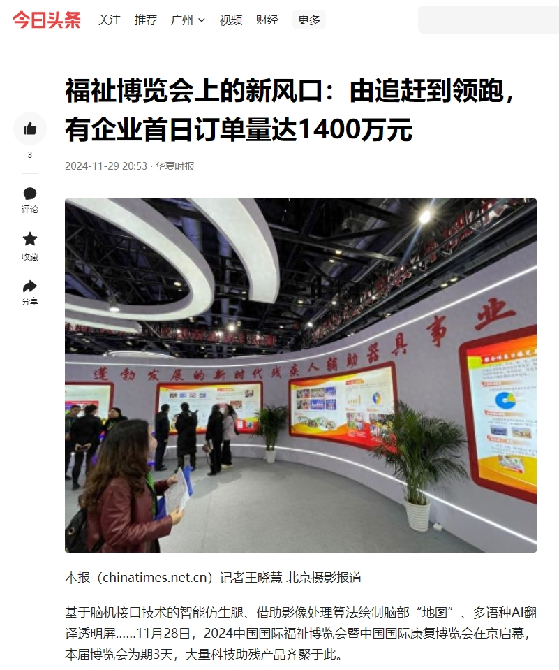 基于腦機接口技術(shù)的智能仿生腿、借助影像處理算法繪制腦部“地圖”、多語種AI翻譯透明屏……11月28日,2024中國國際福祉博覽會暨中國國際康復(fù)博覽會在京啟幕,本屆博覽會為期3天,大量科技助殘產(chǎn)品齊聚于此。