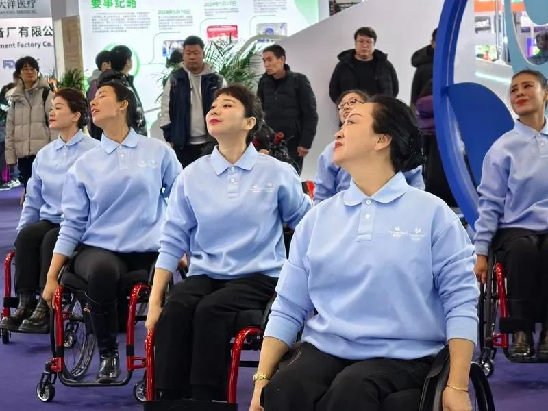 11月28日,2024中國國際福祉博覽會暨中國國際康復博覽會上,王曦婭(右)與朋友們一起表演。劉胤衡/攝
