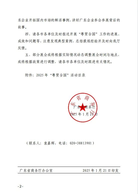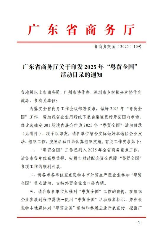 據(jù)了解,“粵貿(mào)全國”是廣東省政府為推動貿(mào)易高質(zhì)量發(fā)展而實施的一項重大工程,旨在通過一系列展會活動,幫助企業(yè)拓展市場、提升品牌影響力,進一步推動廣東省乃至全國的經(jīng)濟發(fā)展。入圍展會將列入2025年全省商務(wù)重點工作,并優(yōu)先獲得政府相關(guān)政策扶持。