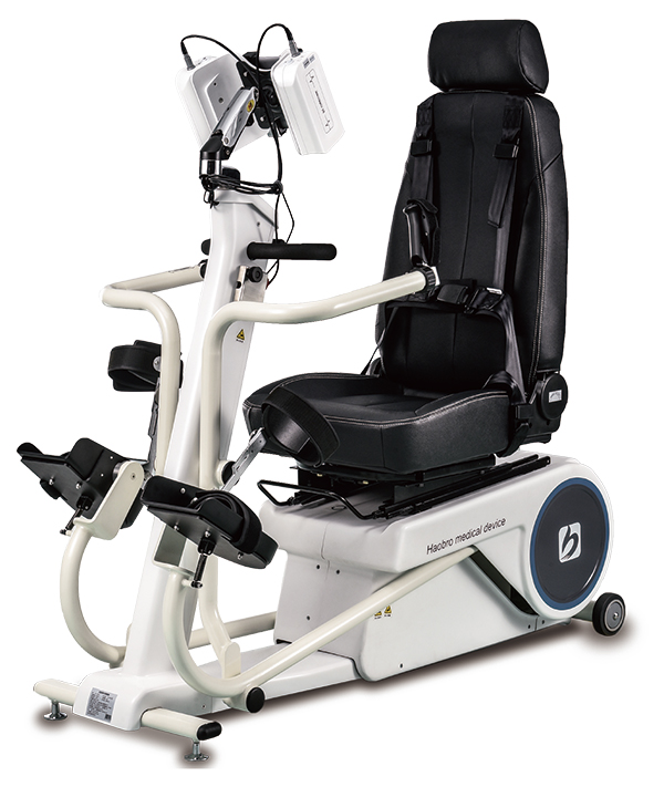 這是一款針對步行功能障礙進(jìn)行高效康復(fù)訓(xùn)練的下肢康復(fù)機(jī)器人。產(chǎn)品由計算機(jī)控制系統(tǒng)、步態(tài)矯正裝置系統(tǒng)、動靜態(tài)減重系統(tǒng)、醫(yī)用跑臺系統(tǒng)以及情景互動訓(xùn)練系統(tǒng)五大模塊組成。它可以使患者在直立體位下通過不斷重復(fù)且軌跡固定的步態(tài)訓(xùn)練,強(qiáng)化正常步態(tài)記憶,促進(jìn)患者本體感覺的輸入與正確運(yùn)動模式的形成,從而加強(qiáng)大腦結(jié)構(gòu)和功能重塑,建立正確的行走模式并有效的鍛煉其相關(guān)肌肉與關(guān)節(jié),加速下肢功能的恢復(fù)。