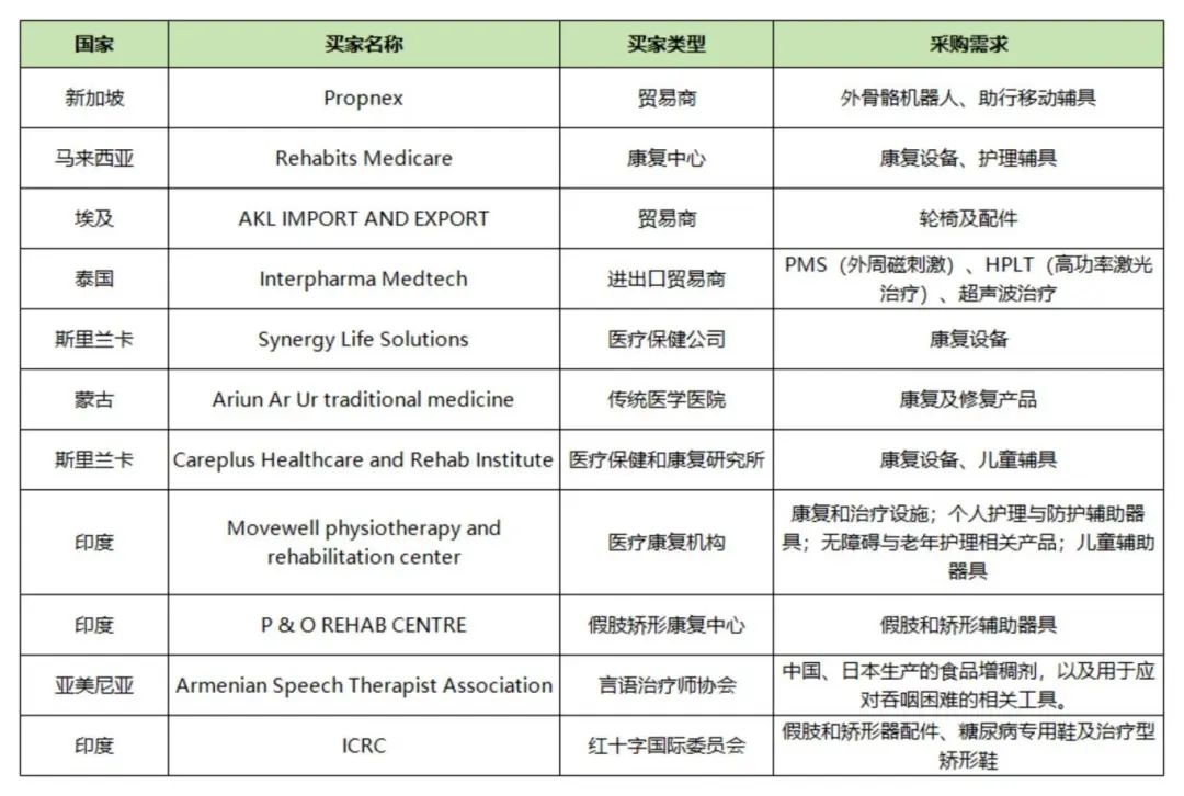 圍繞海外買家的采購需求,福祉博覽會將在9月12日10:00-12:00在北京國家會議中心舉辦“海外買家商貿(mào)配對會”,來自埃及、新加坡、馬來西亞、泰國、印度、蒙古、斯里蘭卡等多個國家的專業(yè)買家,包括醫(yī)院、康復(fù)中心、假肢矯形中心、協(xié)會組織、貿(mào)易商等帶來真實、迫切的采購需求。配對會將助力參展企業(yè)和海外買家高效對接,精準洽談,將商機快速轉(zhuǎn)化為實實在在的訂單,是企業(yè)開拓國際市場不可錯過的“快車道”!