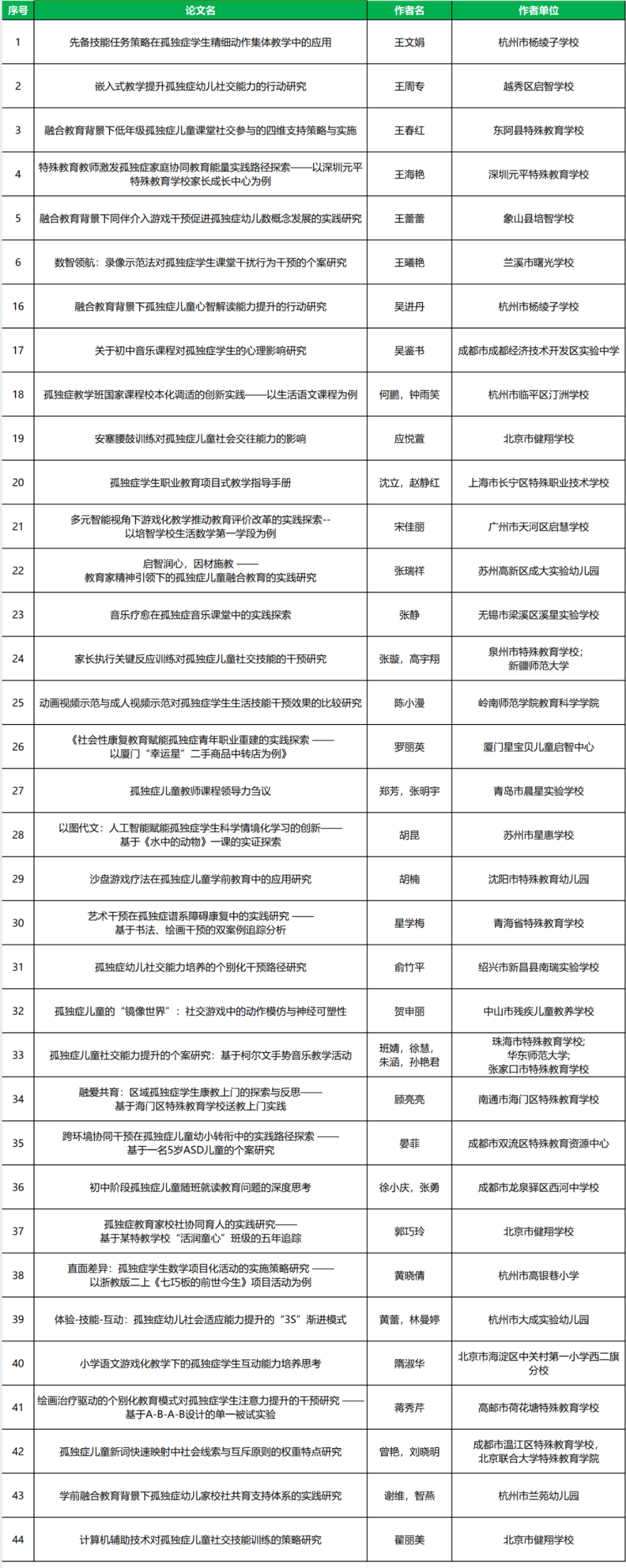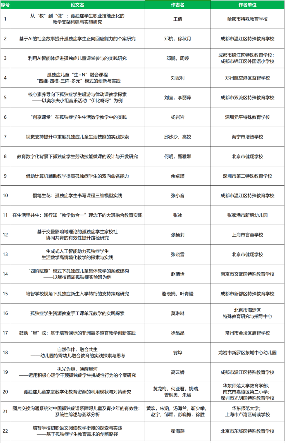 南京特殊教育師范學(xué)院特殊教育學(xué)院聯(lián)合2025中國國際福祉博覽會(huì)暨中國國際康復(fù)博覽會(huì)(CR EXPO)、中國教育學(xué)會(huì)特殊教育分會(huì)智障教育專委會(huì)、殘疾人事業(yè)發(fā)展研究會(huì)融合教育專委會(huì)、江蘇教育報(bào)刊總社現(xiàn)代特殊教育編輯部、北京教育科學(xué)研究院北京市特殊教育研究指導(dǎo)中心、北京市海淀區(qū)特殊教育研究與指導(dǎo)中心、杭州市上城區(qū)特殊教育指導(dǎo)中心等聯(lián)合舉辦的“第二屆孤獨(dú)癥教育教學(xué)論文征集”活動(dòng),征集到全國30個(gè)省市自治區(qū)738篇論文。經(jīng)相關(guān)專家評(píng)審研究決定,共有22篇論文榮獲優(yōu)秀論文,44家篇論文榮獲創(chuàng)新論文,68篇論文為鼓勵(lì)論文。公布如下: