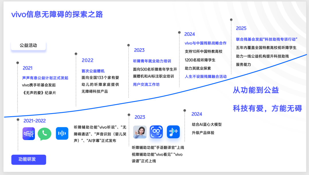 vivo于2021年發(fā)起“聲聲有息”公益計劃,以“科技+公益+生態(tài)”為核心模式,致力于幫助殘障群體跨越數(shù)字鴻溝、實現(xiàn)自我發(fā)展,推動科技普惠真正落地。2024年,vivo與中國殘聯(lián)、中國殘疾人福利基金會達成戰(zhàn)略合作,共同推進科技助殘行動。截至2025年,該計劃已惠及超4000名殘障用戶,支持全國近20所特殊教育高等院校,并通過科技助殘專項行動覆蓋10000余名殘障伙伴。