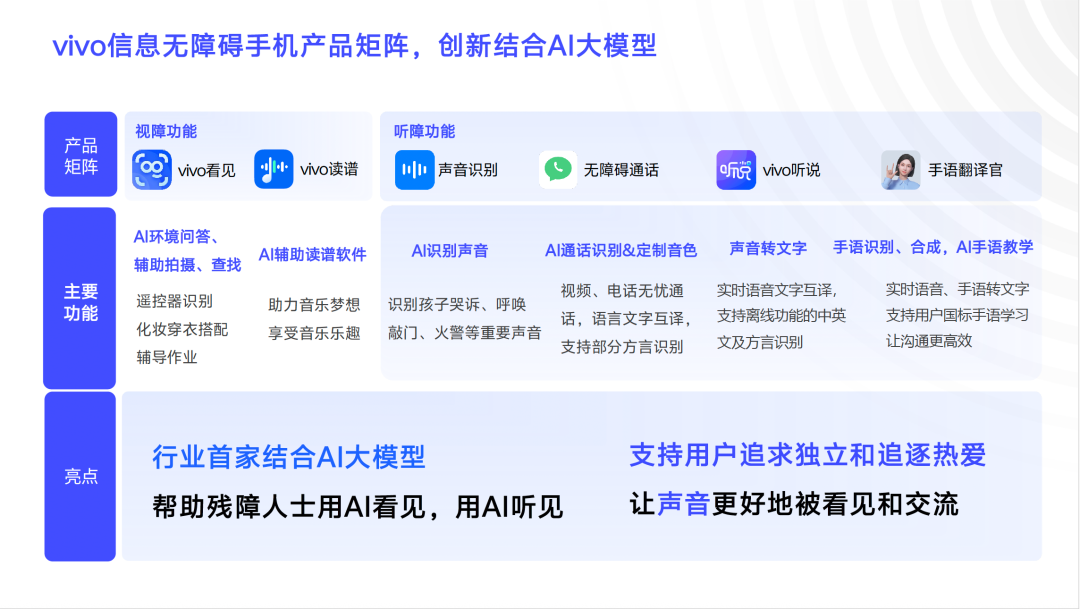 vivo以系統(tǒng)性無障礙解決方案踐行“科技照亮美好未來”的企業(yè)使命。在聽覺支持方面,“vivo聽說”實現(xiàn)實時語音文字互轉(zhuǎn),助力聽障人士暢通交流;“聲音識別”功能可敏銳捕捉環(huán)境關(guān)鍵音;全球首款“手語翻譯官”可識別1300個手語詞匯,準(zhǔn)確率超85%,有效打破溝通壁壘。在視覺輔助領(lǐng)域,“vivo看見”依托自研多模態(tài)大模型,幫助視障用戶感知環(huán)境、識別物品保質(zhì)期、輔助育兒與閱讀;“vivo讀譜”則開創(chuàng)性地為盲人提供免費鋼琴學(xué)習(xí)支持,替代傳統(tǒng)厚重盲譜。從單一功能到生態(tài)共建,從技術(shù)創(chuàng)新到公益落地,vivo始終圍繞“有愛無礙”的初心,讓科技真正服務(wù)于人。