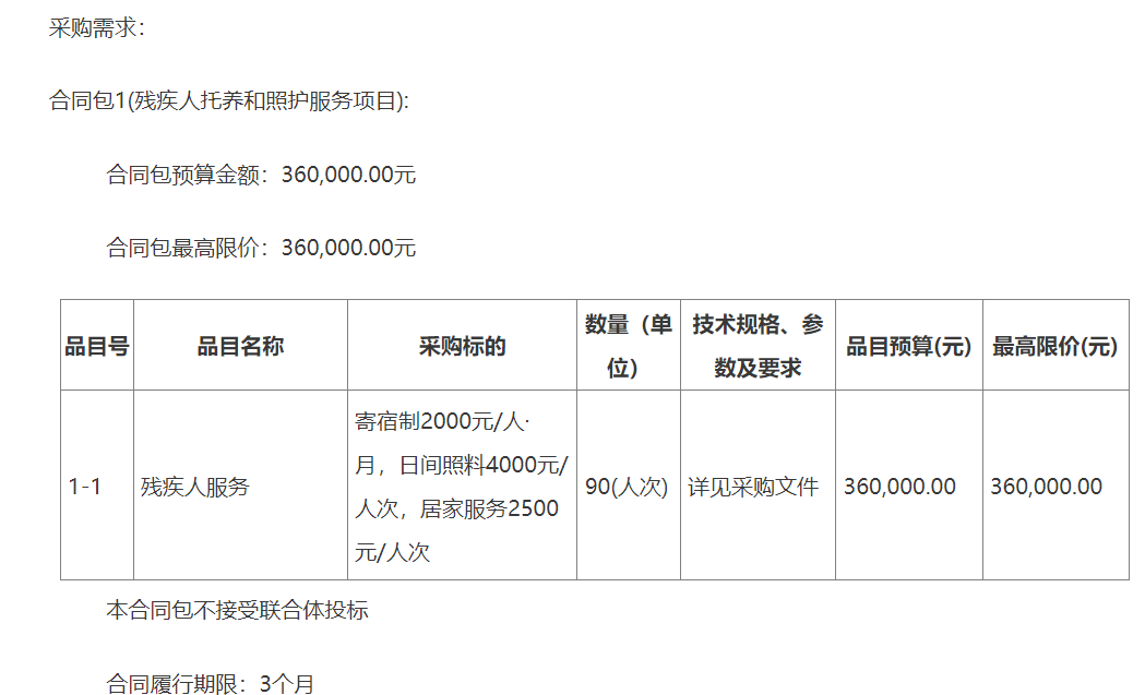 對(duì)處于就業(yè)年齡段的智力、精神殘疾人及重度肢體殘疾人進(jìn)行托養(yǎng)服務(wù),共計(jì)274人。對(duì)接受托養(yǎng)服務(wù)的殘疾人提供以生活照料和護(hù)理、生活自理能力訓(xùn)練和社會(huì)適應(yīng)能力訓(xùn)練為主,輔之以運(yùn)動(dòng)功能訓(xùn)練、職業(yè)康復(fù)與勞動(dòng)技能訓(xùn)練等服務(wù)。本項(xiàng)目分三個(gè)標(biāo)包(每個(gè)供應(yīng)商可同時(shí)投多個(gè)標(biāo)包,但最多只能中一個(gè)標(biāo)包)。A包對(duì)處于就業(yè)年齡段的重度肢體殘疾人進(jìn)行托養(yǎng)服務(wù),共134人,即20.1萬(wàn)元;B包對(duì)處于就業(yè)年齡段的精神殘疾人進(jìn)行托養(yǎng)服務(wù),共120人,即18萬(wàn)元;C包對(duì)處于就業(yè)年齡段的精神殘疾人進(jìn)行托養(yǎng)服務(wù),共20人,即3萬(wàn)元。