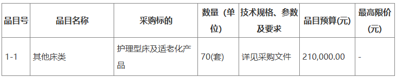采購需求:活護(hù)理和醫(yī)療設(shè)備采購,包括護(hù)理床、氣墊床、專用沐浴床椅、電加熱保溫餐車、搶救床、吸痰器、無菌柜、紫外線燈。
