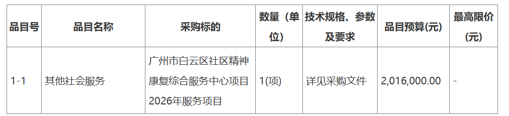廣州市白云區(qū)社區(qū)精神康復綜合服務中心項目2026年服務項目公開招標公告