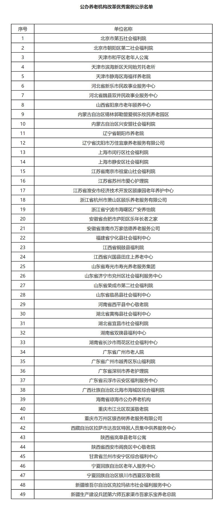 根據(jù)《民政部辦公廳國家發(fā)展改革委辦公廳關于開展公辦養(yǎng)老機構改革試點工作總結推廣公辦養(yǎng)老機構改革典型經(jīng)驗的通知》(民辦函〔2020〕57號)要求,民政部養(yǎng)老服務司、國家發(fā)展改革委社會發(fā)展司開展了公辦養(yǎng)老機構改革典型經(jīng)驗收集及遴選工作,按照地方推薦、專家評審、部門聯(lián)審等程序,遴選出了北京市第五社會福利院等49家公辦養(yǎng)老機構改革優(yōu)秀案例,現(xiàn)予公示。