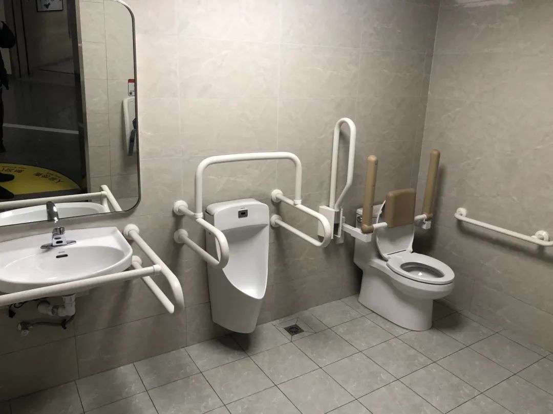 無障礙衛(wèi)生間里,扶手及緊急呼叫裝置一應(yīng)俱全,為行動不便人士提供了安全順暢的如廁空間。