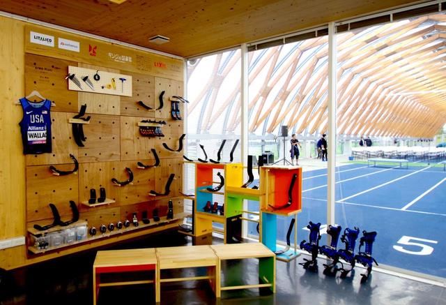 “大棚”下的60米田徑跑道 Brillia Running Stadium官網(wǎng) 圖走進(jìn)“假肢圖書館”,可以看到一整面墻上掛著各種各樣的假肢和配件。如果你看過(guò)殘奧會(huì)田徑場(chǎng)上 “刀鋒戰(zhàn)士”的風(fēng)采,那一定對(duì)這些細(xì)長(zhǎng)的“U”字型的裝置并不陌生,這里提供的就是和專業(yè)殘奧運(yùn)動(dòng)員一樣的碳纖維競(jìng)技型假肢。