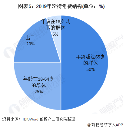 輪椅的主要需求領(lǐng)域?yàn)槔夏耆丝诤蛡麣埲耸?,?yīng)用場景為醫(yī)院,居家養(yǎng)老以及傷殘康復(fù)。從消費(fèi)主力群體來看,輪椅主要是超過65歲的老年人使用。目前輪椅在市場的消費(fèi)主要集中在老年人群體,2019年占比約50%,年齡在18~64歲的消費(fèi)群體占比約25%,此外還有約20%的部分用于出口,主要的出口國家包括美國、加拿大、澳大利亞、英國、阿根廷等等。